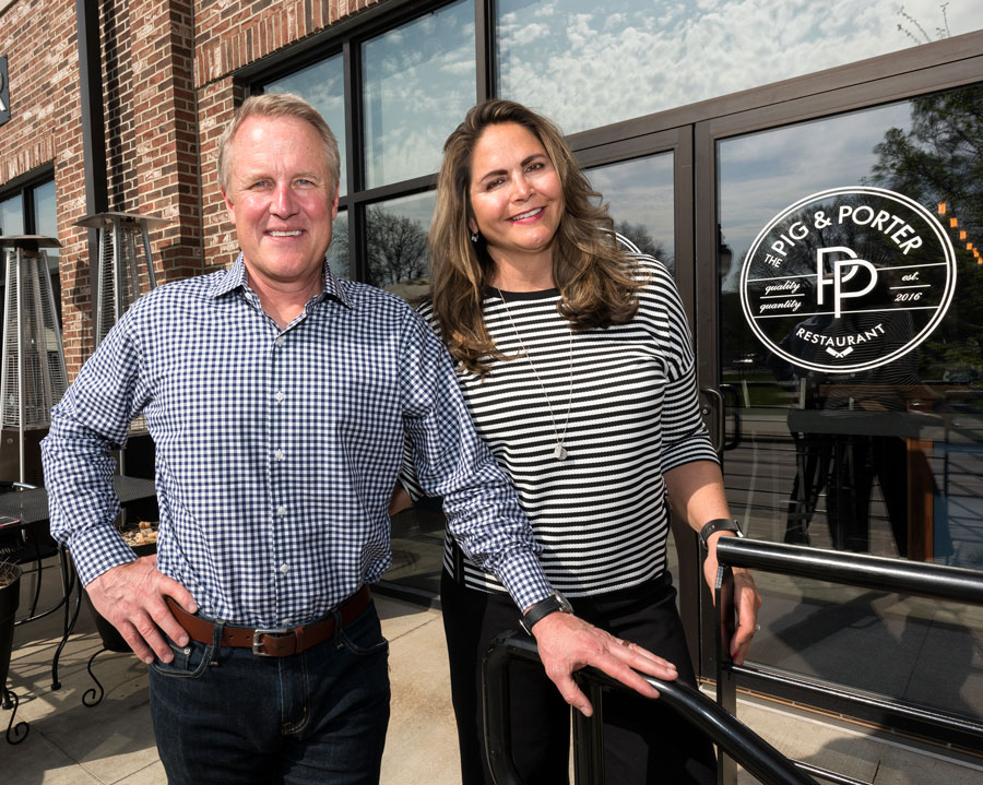 Donors Barry and Gilda Boyer stand in front of a MICRO loan recipient, The Pig & Porter Restaurant, located in Downtown Cedar Rapids, Iowa. |